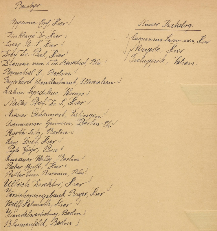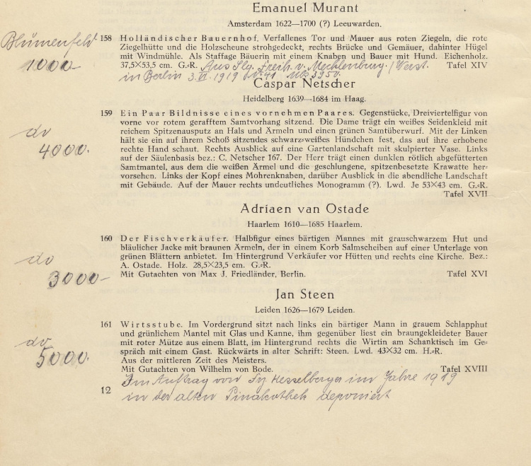 Was verraten nun die vorhandenen Karteikarten über die Transaktionen? Am 14.10.1919 veräußerte der Münchner Lederwaren-Fabrikant Franz Hesselberger (1876–1935) das Steen‘sche Gemälde für 4.000 Mark an Böhler. Nur sechs Tage später verkaufte es die Münchner Firma für 6.000 Mark an ihre Luzerner Schwesterfirma, die KHAG, die im selben Jahr vom Junior der Familie, Julius Wilhelm Böhler (1883–1966), und dem Kölner Kunsthändler Fritz Steinmeyer (1880–1959) gegründet worden war. Weitere sieben Tage später gab die KHAG Luzern das Bild für sagenhafte 25.000 Mark erneut nach München, nun als Kommissionsware. Noch am selben Tag, am 27.10.1919, gelang Böhler der Verkauf an einen seiner besten Kunden, den ungarischen Finanzmagnaten und Kunstsammler Marcell von Nemes (1866–1930), für ebenjenen Preis. Nach Abzug von Steuer und Kommission blieb ein Gewinn von 20.250 Mark.