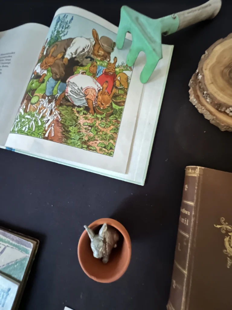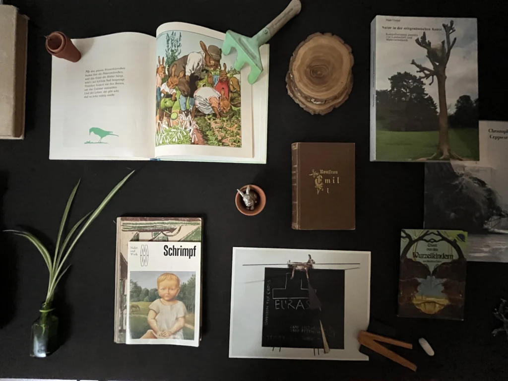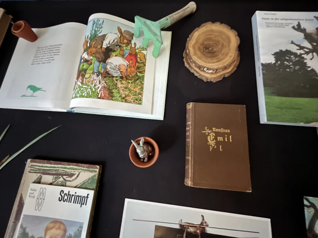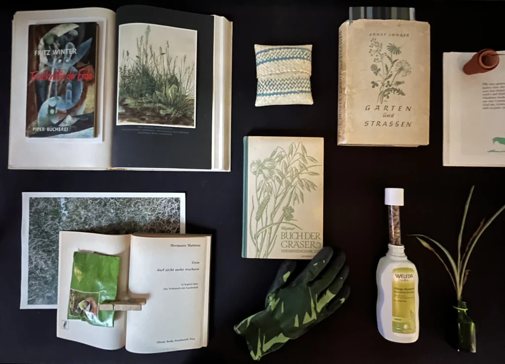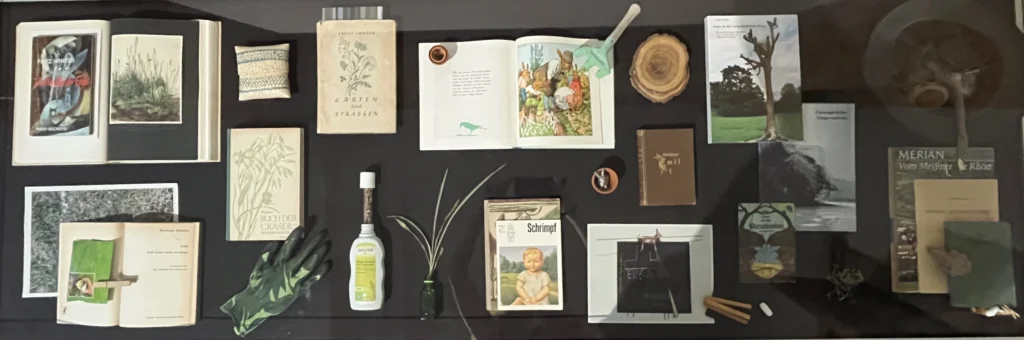 Seit März 2025 wird eine Vitrine im ZI als eine Art Hochbeet von Nanne Buurman (Forschungsgruppe Kunst, Umwelt, Ökologie) kuratorisch-forschend „begärtnert“. Fortlaufend neu arrangiert und ergänzt, entstehen in dieser experimentellen Versuchsanordnung im Laufe des Jahres immer wieder neue Konstellationen zwischen den ausgestellten Materialien, die saisonal jeweils andere inhaltliche und ästhetische Querverbindungen in Erscheinung treten lassen. Der prozessual und assoziativ angelegte visuelle Essay zu Ambivalenzen von Naturkonzeptionen und ökologischem Denken in Moderne und Gegenwart lädt zur Reflexion über romantisierende, biopolitische, völkische und ökonomische Dimensionen des Ökologischen in Kunst und Kultur ein.