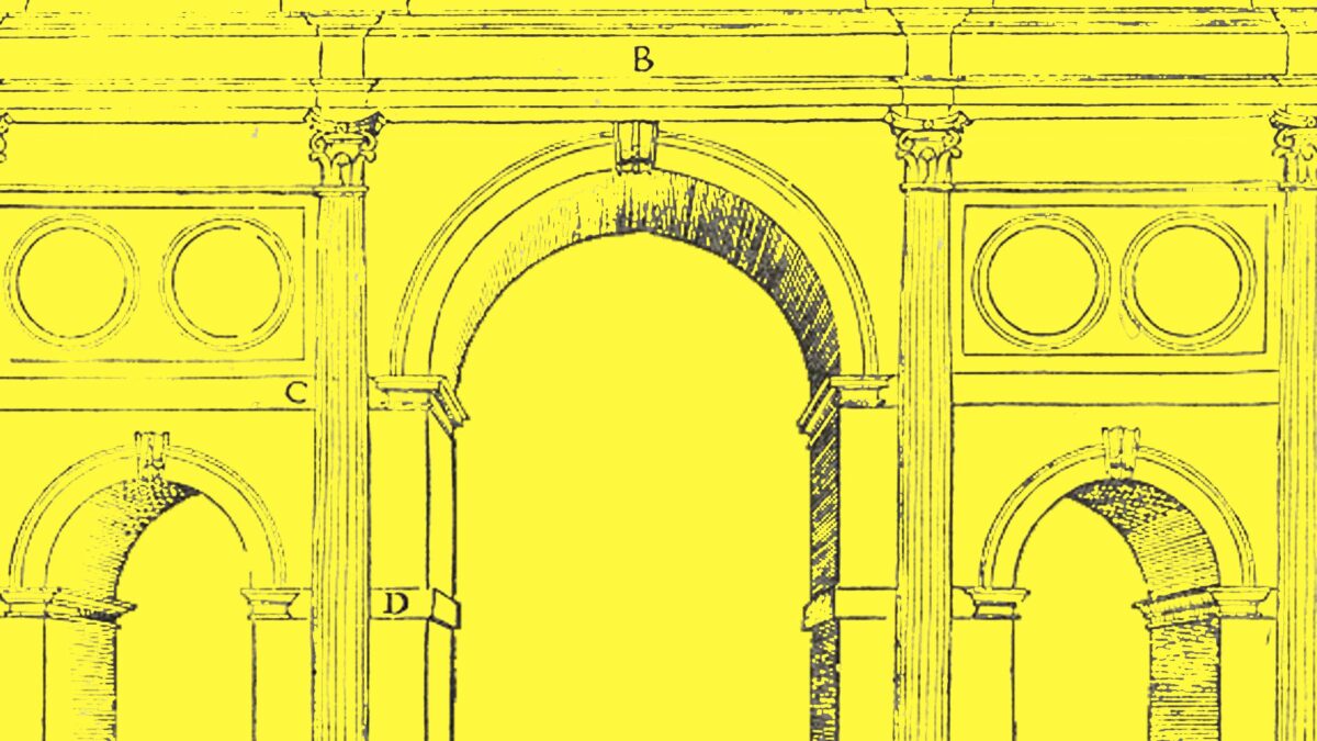 Speziell der antiken Architektur Roms gewidmet ist der dritte Band [BZI: 4° CA 255/436 R] des Sette libri d’archittetura genannten Architektur-Traktats des aus Bologna stammenden Malers und Architekten Sebastiano Serlio (1475–1554). Zwischen 1537 und 1575 – das siebte Buch erschien posthum – verfasste Serlio insgesamt sieben Bände zur klassischen Architektur, die das damalige Wissen zur Architekturtheorie bündeln sollten. Fragmente zweier weiterer Bücher aus der Feder Serlios wurden im 20. Jahrhundert veröffentlicht. Der dritte Band behandelt ausführlich die antiken Bauten Roms, darunter das Pantheon, das Kolosseum oder den Konstantinsbogen (Abb. 3), deren Architektur im 16. Jahrhundert als vorbildhaft galten. Erfasst wurde von Serlio dabei auch die Weihinschrift im Zentrum auf der Vorderseite des Triumphbogens, die an Kaiser Konstantins Sieg über seinen Konkurrenten Maxentius in der Schlacht an der Milvischen Brücke im Jahr 312 erinnert.