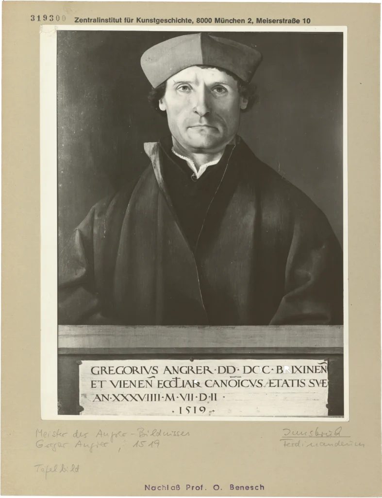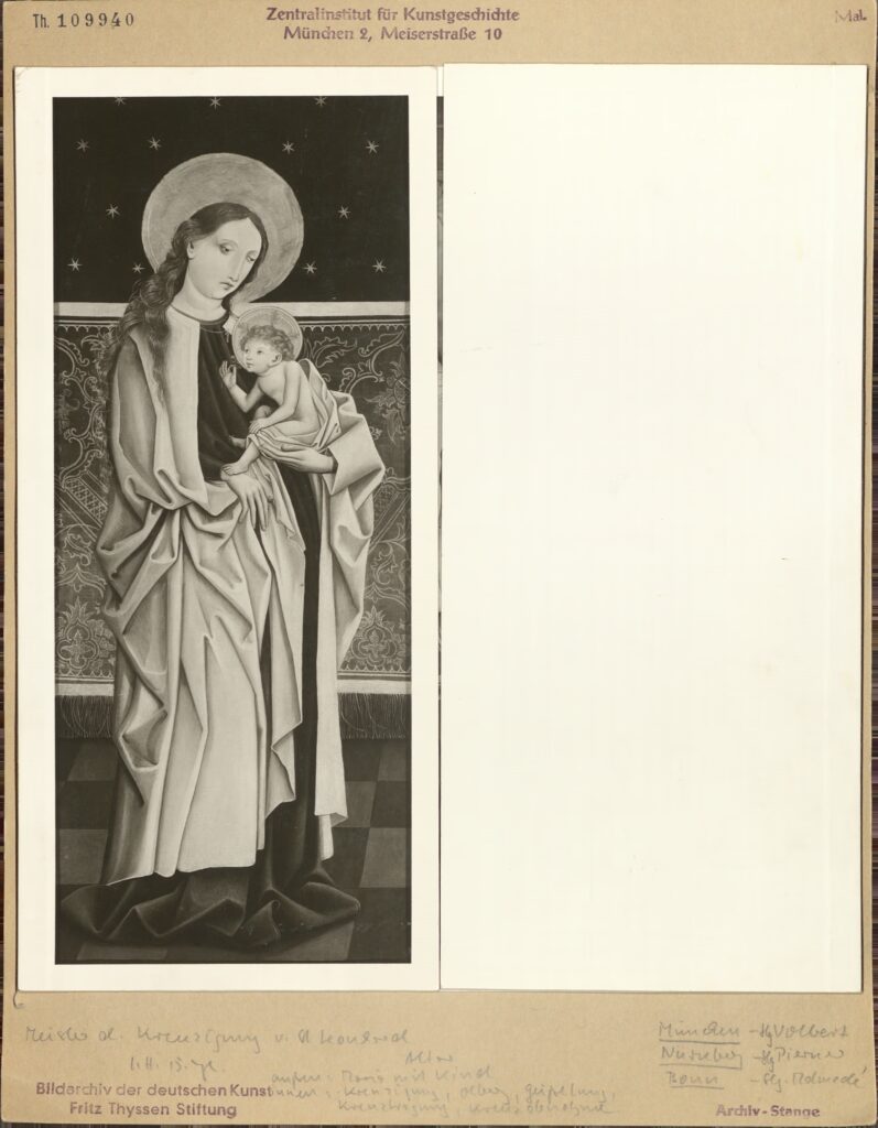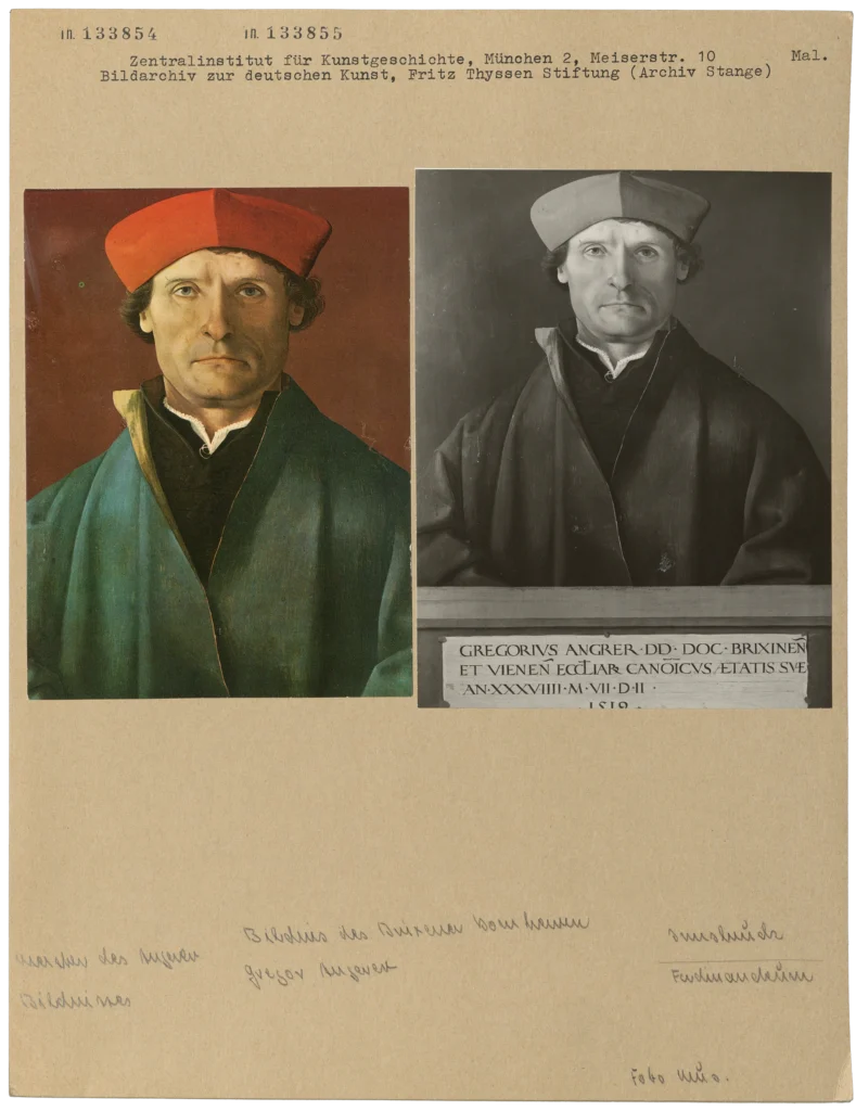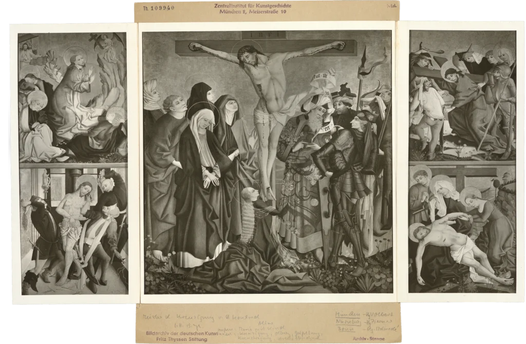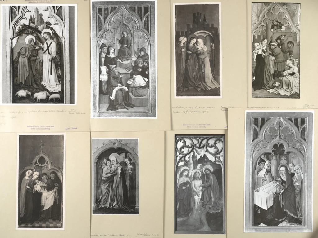 So finden sich in den Nachlässen von Benesch und Stange insgesamt 14 Abbildungen, die den Marienzyklus eines Altars des „Meisters von Schloss Lichtenstein“, tätig um 1450, zeigen. Die Tafeln des Zyklus sind heute weltweit verteilt: Philadelphia (Art Museum), Tallinn (Niguliste Muuseum), Warschau (Muzeum Narodowe w Warszawie), Moskau (Puschkin-Museum), vorm. Berlin (Deutsches Museum, Kriegsverlust), München (Bayer. Staatsgemäldesammlungen) und Wien (Belvedere). Zwei der Tafeln sind am Auslagerungsort in Berlin während des Zweiten Weltkriegs verloren gegangen. Monika Wagner (Wagner 2022) spricht in diesem Zusammenhang von „fotografischer Mortifizierung“ und meint damit verschollene oder zerstörte Gemälde, deren Aussehen heute nur mehr von Schwarz-Weiß-Fotos bekannt ist. Auch in der Photothek des ZI finden sich solche Beispiele, darunter auch Aufnahmen, die ausschließlich hier überliefert sind.