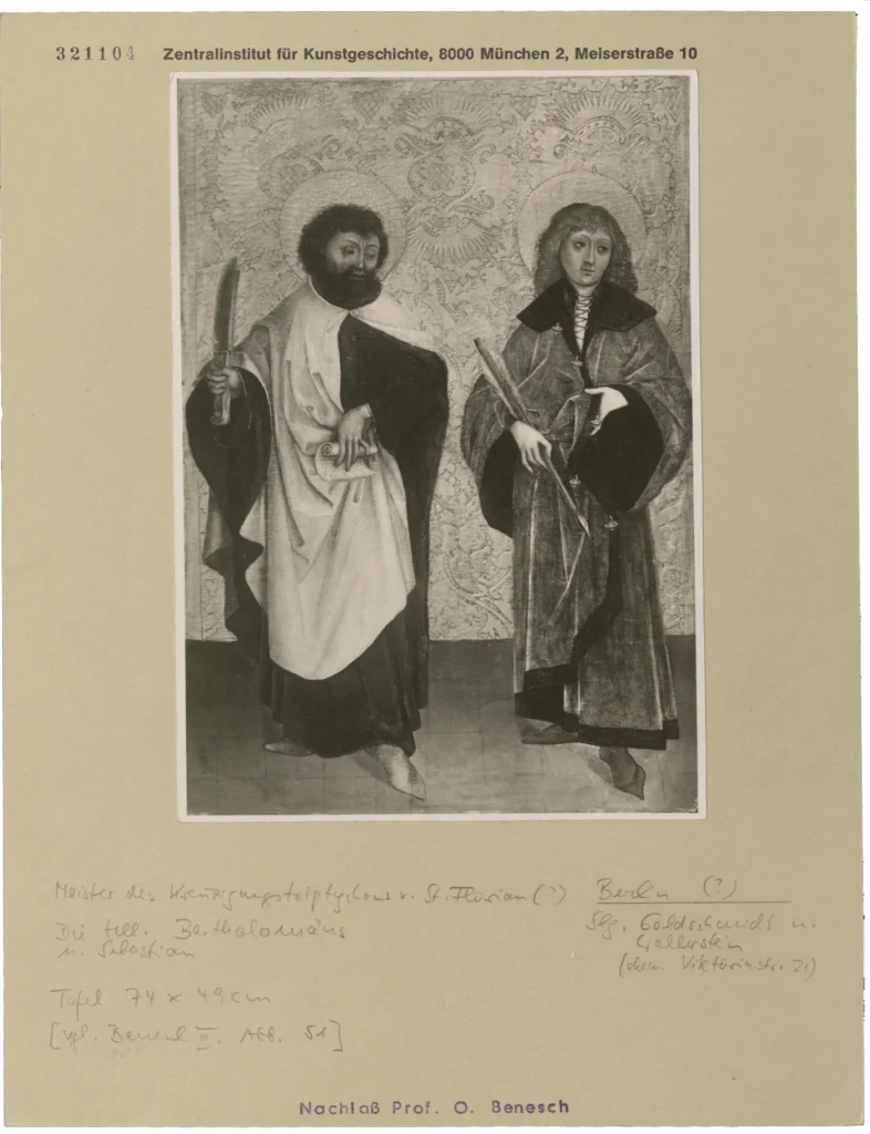 Annotationen der drei Kunsthistoriker auf den Rückseiten der Fotografien – zum Teil auch ausführliche Gutachten – vermerken die Namen vorheriger Besitzer*innen, nennen Sammlungen oder geben ehemalige Standorte der Kunstwerke an; in der Regel wurden diese Informationen auf den Fotokarton übertragen. Aus dem Nachlass Beneschs hat sich ein solcher Hinweis rechts unterhalb der Abbildung der Hll. Bartholomäus und Sebastian erhalten: „Berlin (?), Slg. Goldschmidt und Wallerstein (ehem. Viktoriastraße 21)“. Die zwangsweise Schließung der 1919 gegründeten Galerie Goldschmidt-Wallerstein in Berlin, geführt von zwei jüdischen Kunsthistorikern, erfolgte 1934, ihre endgültige Liquidierung zwei Jahre später.