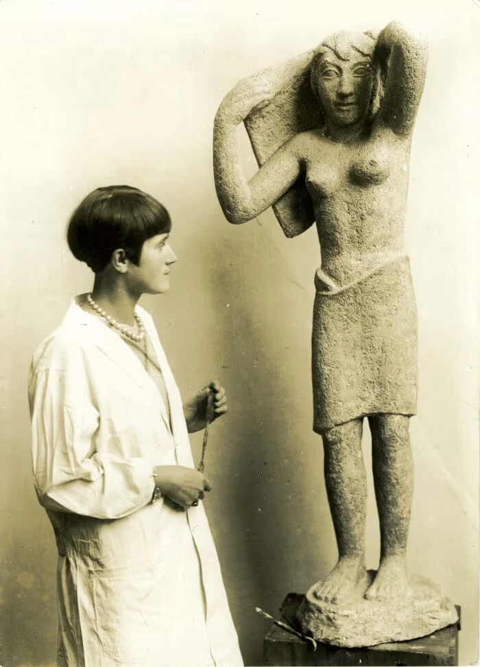 Ab den 1910er/20er-Jahren setzte sich bei Bildhauerinnen oftmals eine Kurzhaarfrisur anstatt der antikisierend geflochtenen Haare Sevastos‘ durch und ein bis zu den Waden reichender, zugeknöpfter langer, engerer Arbeitskittel, wie ihn Ingenieurinnen oder Medizinerinnen tragen, etwa im Atelierportrait Jenny Mucchi-Wiegmanns (Abb. 3) oder Louise Stomps (Vgl. auch Julia Wallner/Günter Ladwig (Hg.), Die erste Generation. Bildhauerinnen der Berliner Moderne, Berlin 2018).
